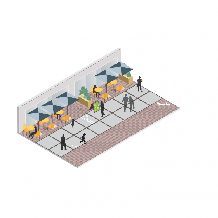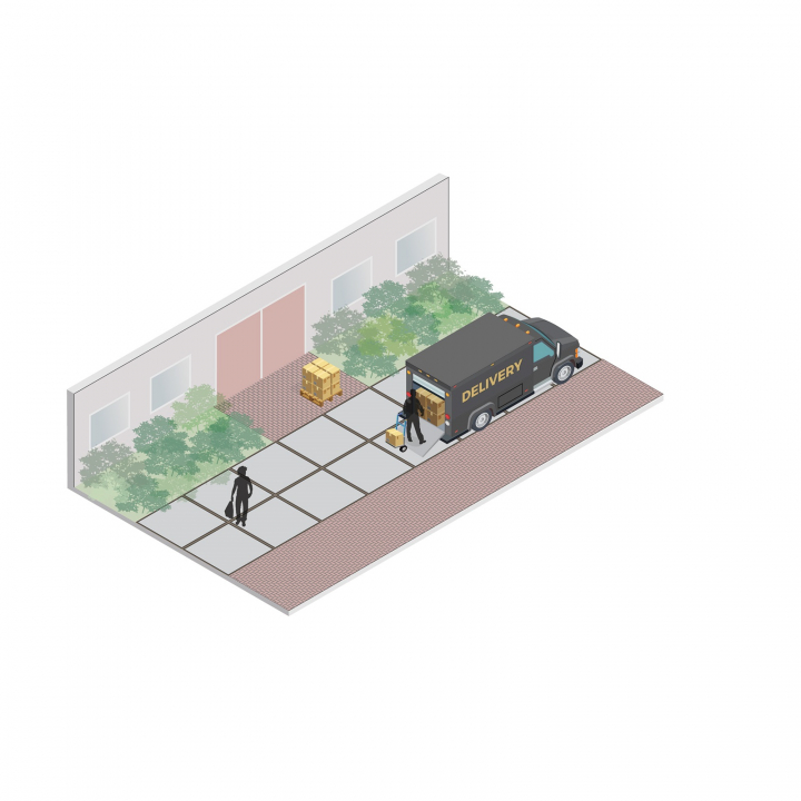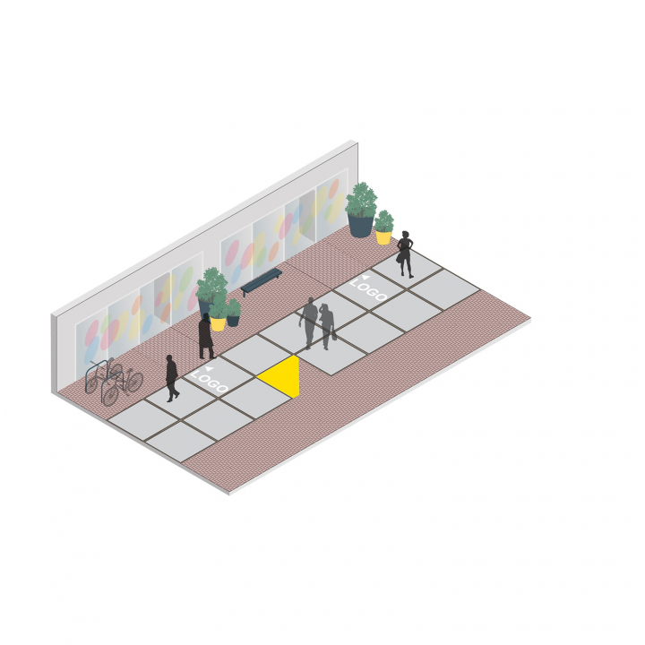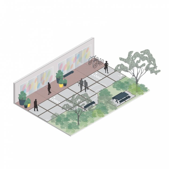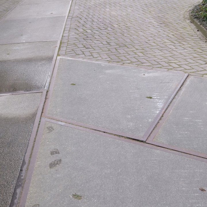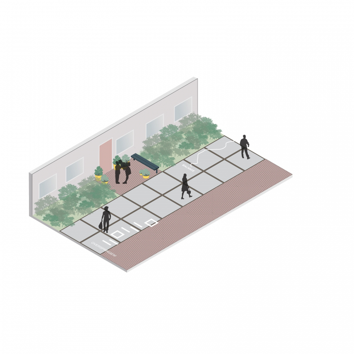 The landscape design integrates as many existing materials and objects as possible, including the pavement of concrete slabs. Next to the regular pavers, there is a wide variety of odd-sized slabs. These have been cataloged, preserved and will be reused in the future plan. Regular slabs are used for the central walkway, while the deviating sizes form a differentiation in the paving pattern.