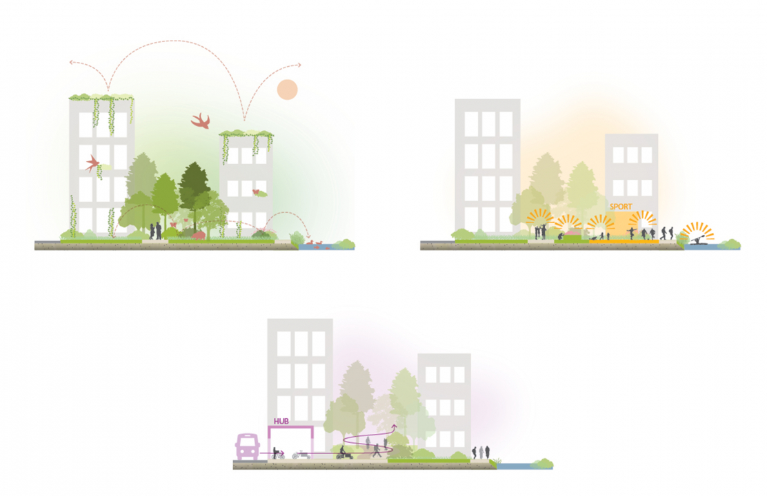 For the landscape design we teamed up with MOVE Mobility and Bureau Stadsnatuur and we work in close with the Utrecht municipality, BURA, the developers and (local) stakeholders. Our mutual goal for Merwede is to design an inviting, green and lively public space for this new urban district, with maximum urban nature and a largely car-free public space that prioritizes pedestrians and cyclists. We see Merwede as an urban nature area with a great diversity of biotopes and robust green structures, where intuitive navigation leads you to lively public spaces.