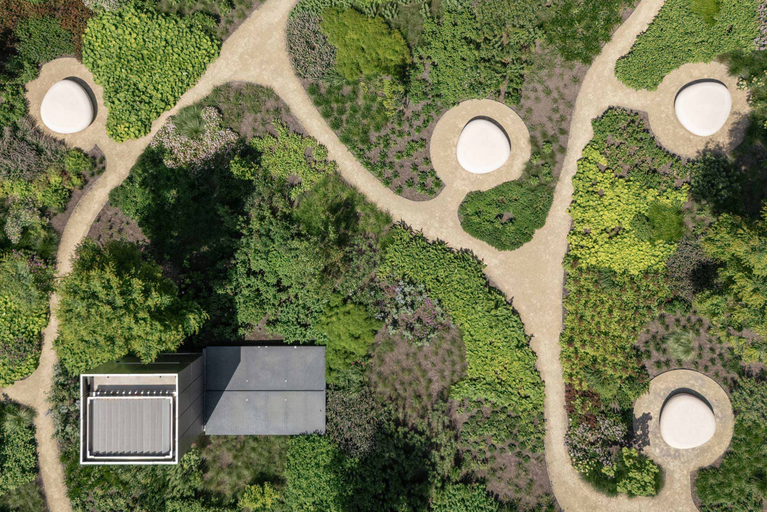 The garden is a lush planted and peaceful place. Carefully framed, it is designed as a large ‘nature painting’. Every season reveals a new beautiful color and shape, utilizing the seasonal dynamics in its best interest. The garden is fitted with pebble-shaped sitting objects and from these benches, one can enjoy the activities of the animals, insects and people in garden in the best possible way.