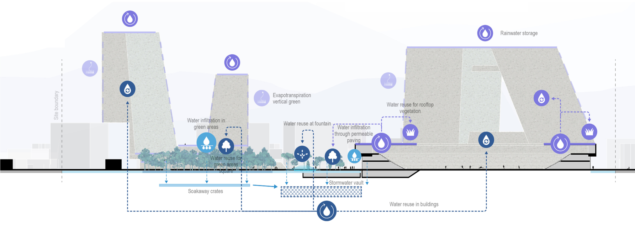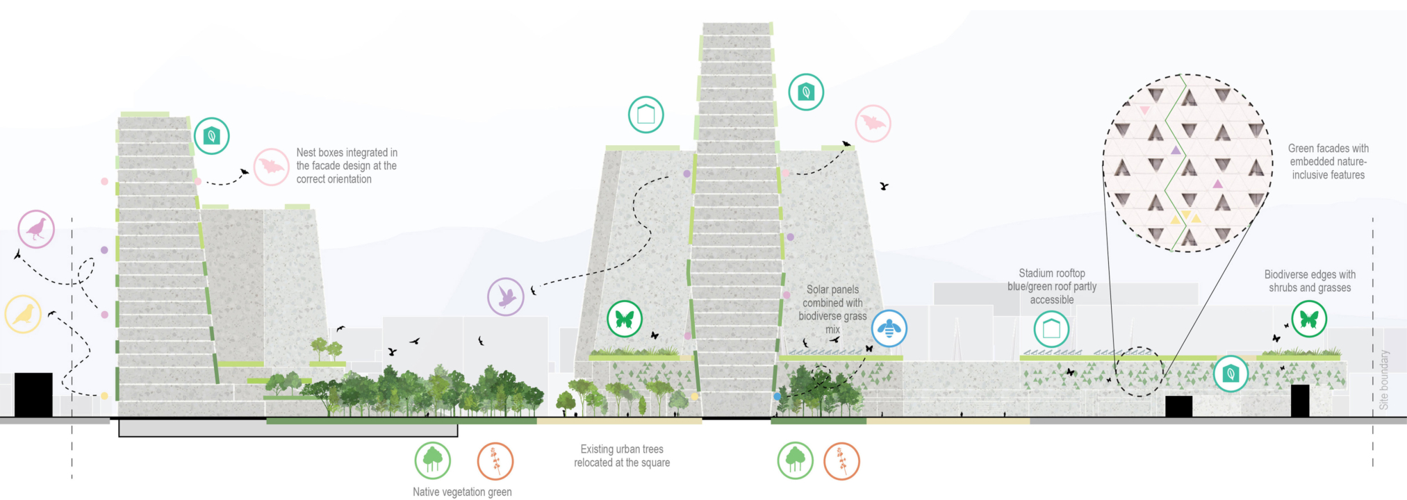 LOLA designed the public open space of the revitalized stadium, with the goal of establishing a common space for everyday needs, bringing residents together, and a square that shines at events, welcoming big crowds. The landscape design respects the existing scale and program, valuing the fine grain of the existing public space and identifying some ‘community anchors’ that are kept to ensure a continuity in use, such as basketball fields, chess tables, and a kids playground. Around these moments, new leisure and gathering opportunities enrich the public space and create a lively square that is active all-year-round.