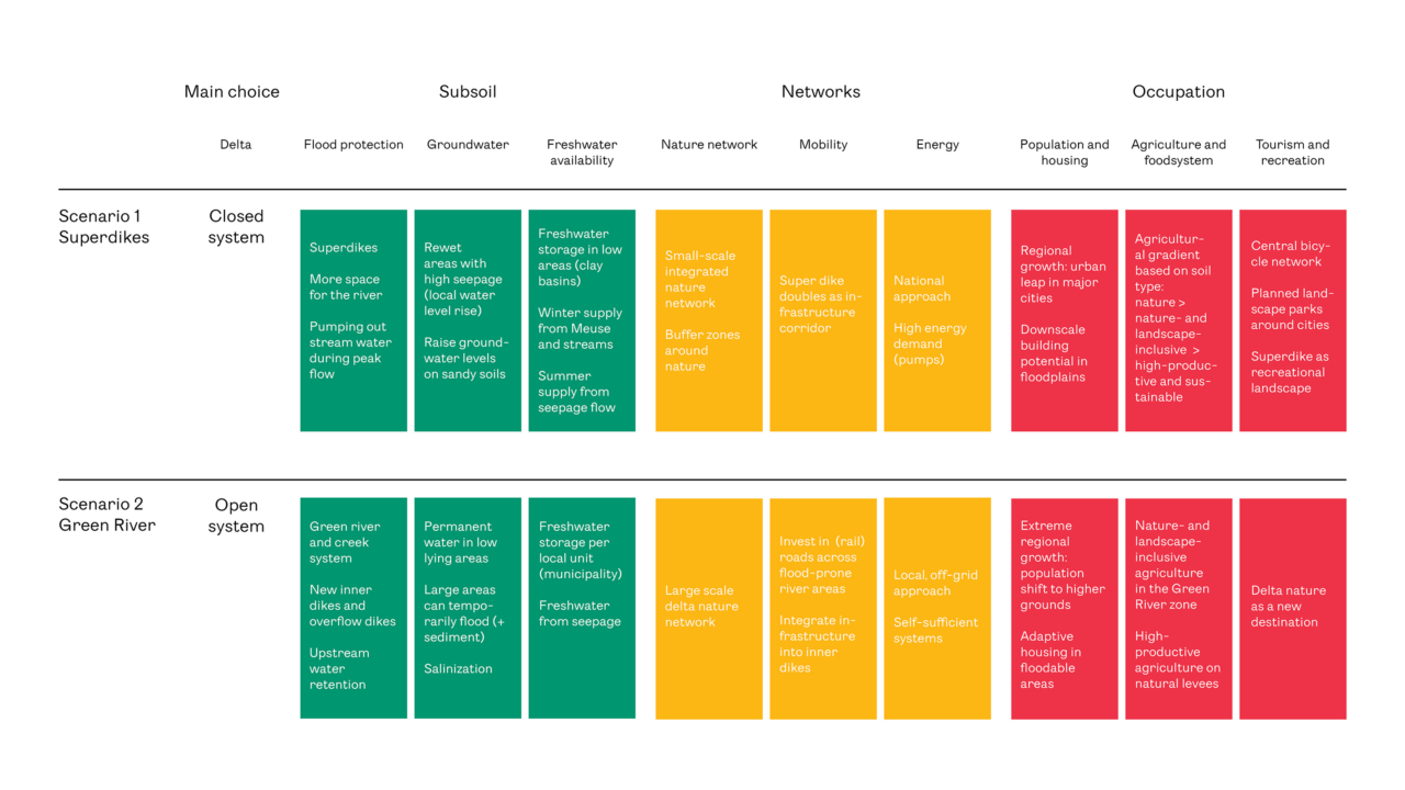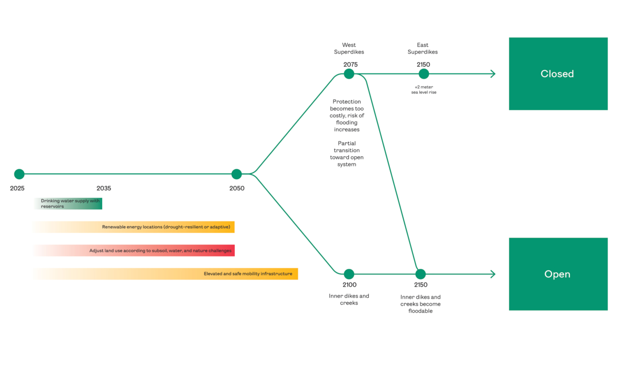 This scenario envisions a technologically driven, closed system featuring superdikes measuring 90 to 150 meters wide, powerful pumping systems, and strategic river expansions where urban bottlenecks arise. Strong central governance is essential to ensure maximum water safety.