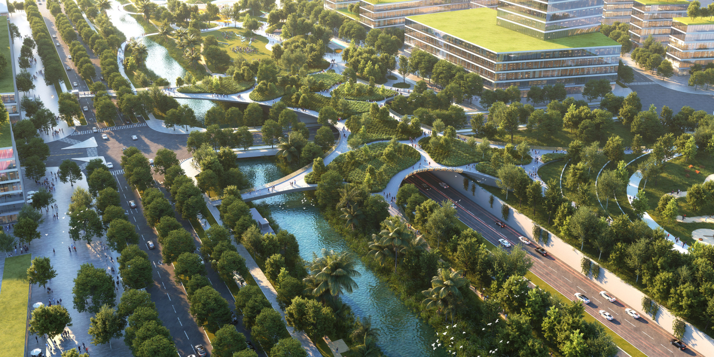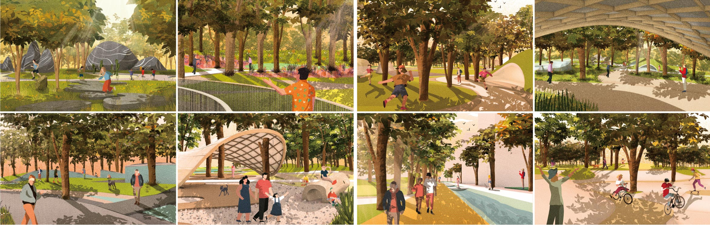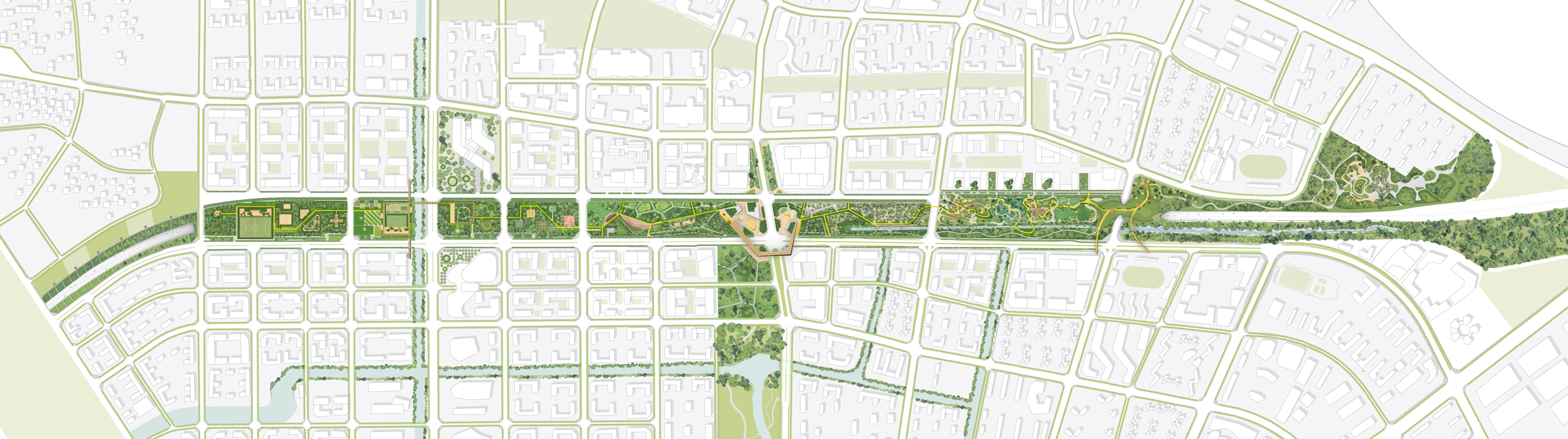 The eastern segment extends the surrounding natural mountain landforms into the city, and brings the surrounding communities and schools together to create a large-scale outdoor playground with an adventurous variety, and natural quality. At the end of the park the highway is covered with a large land bridge, that combines migrating routes for small animals and people. It is combined with the ‘ecological canopy plan’, maximizing