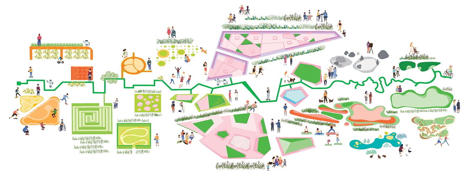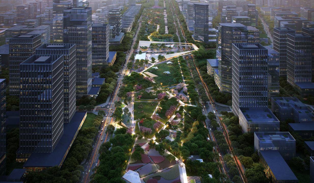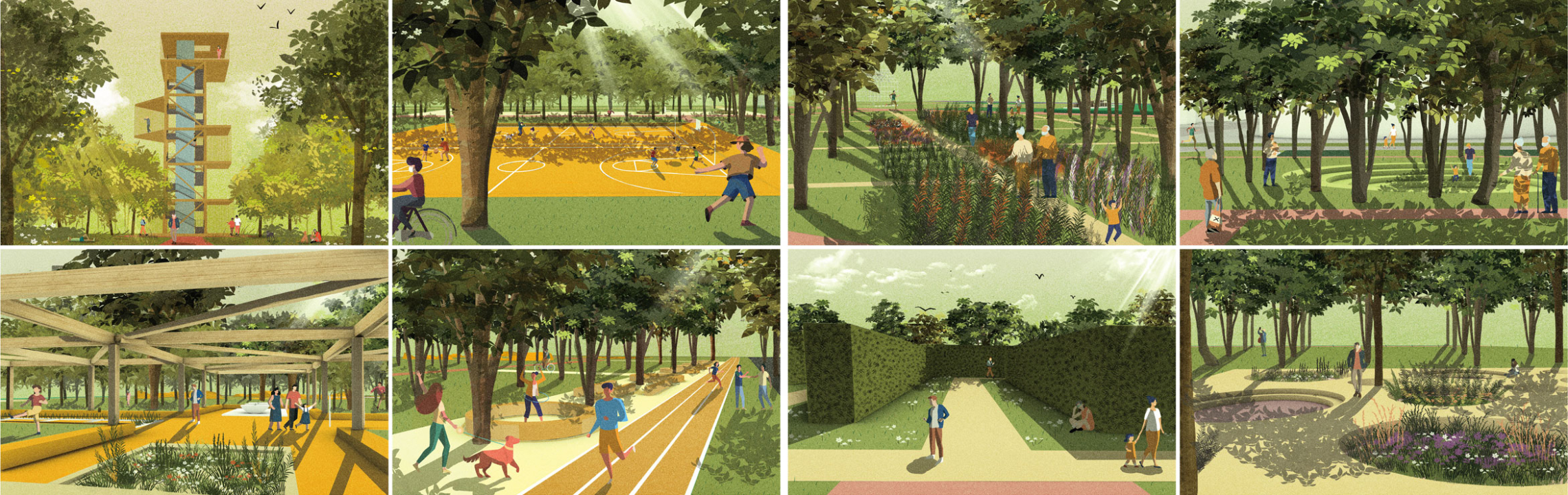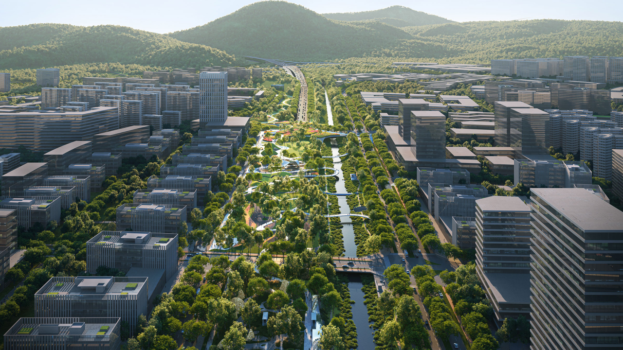 The eastern segment extends the surrounding natural mountain landforms into the city, and brings the surrounding communities and schools together to create a large-scale outdoor playground with an adventurous variety, and natural quality. At the end of the park the highway is covered with a large land bridge, that combines migrating routes for small animals and people. It is combined with the ‘ecological canopy plan’, maximizing