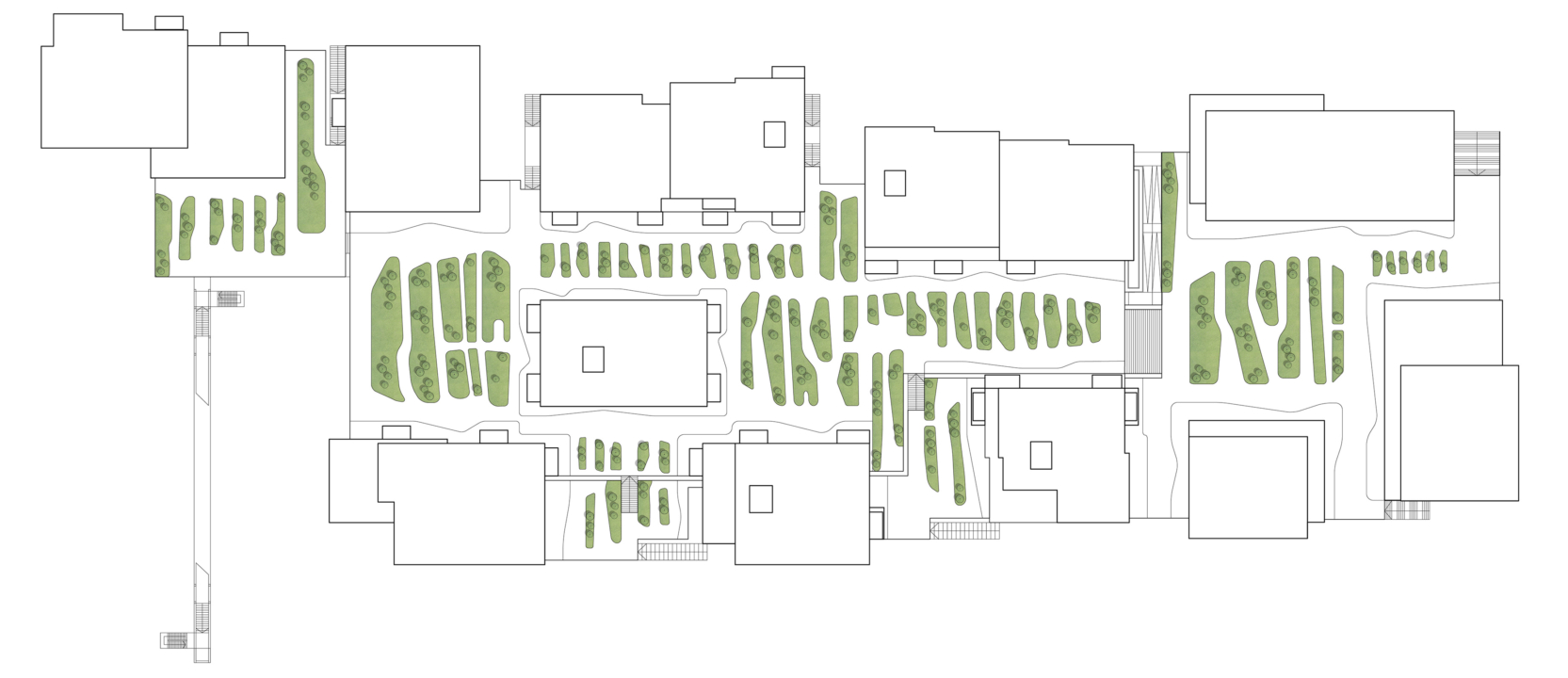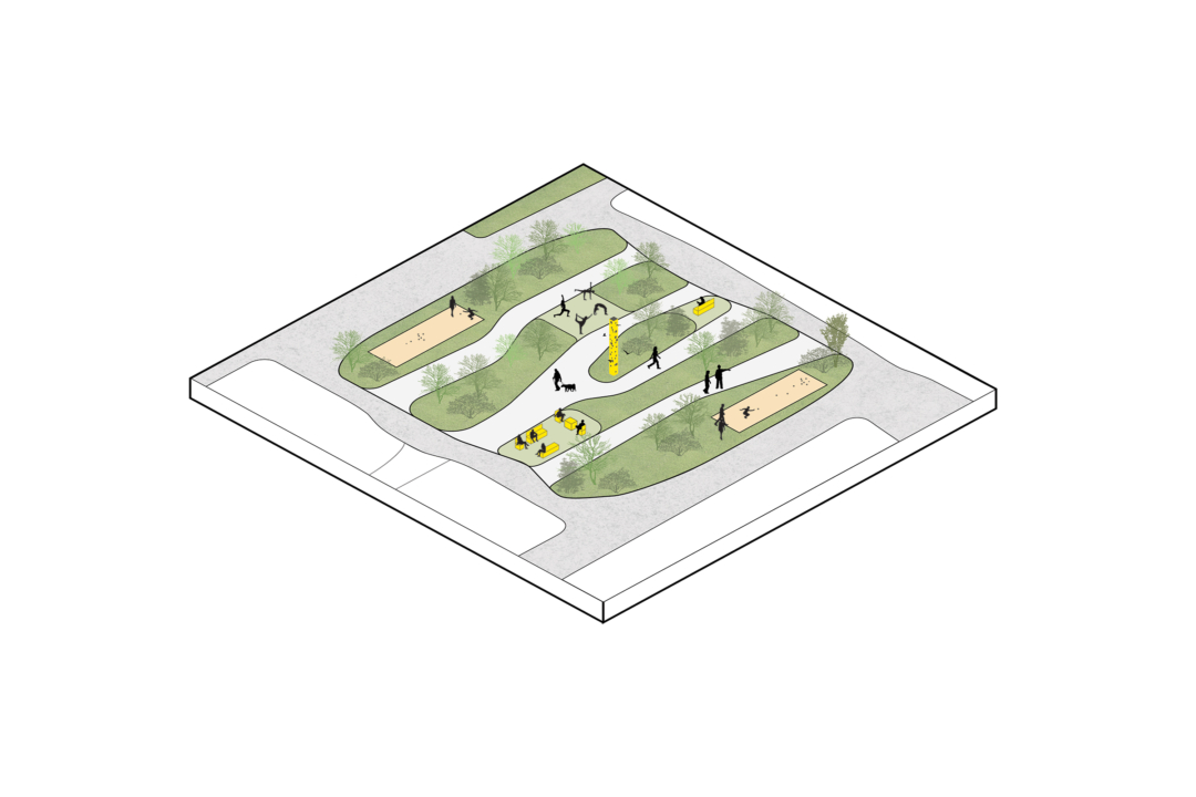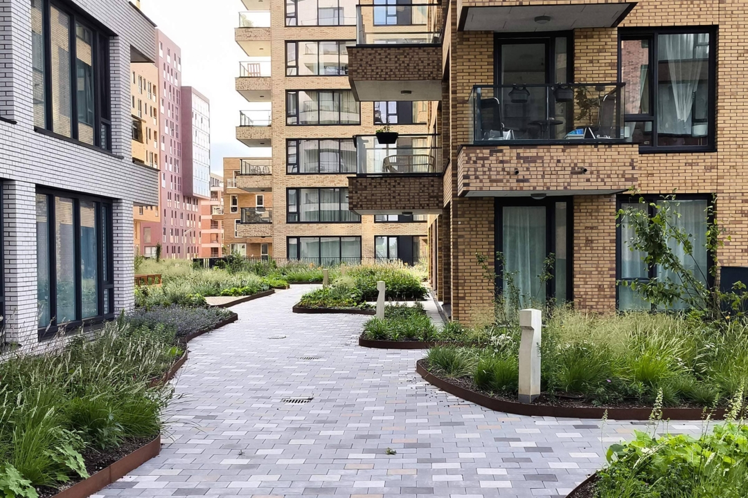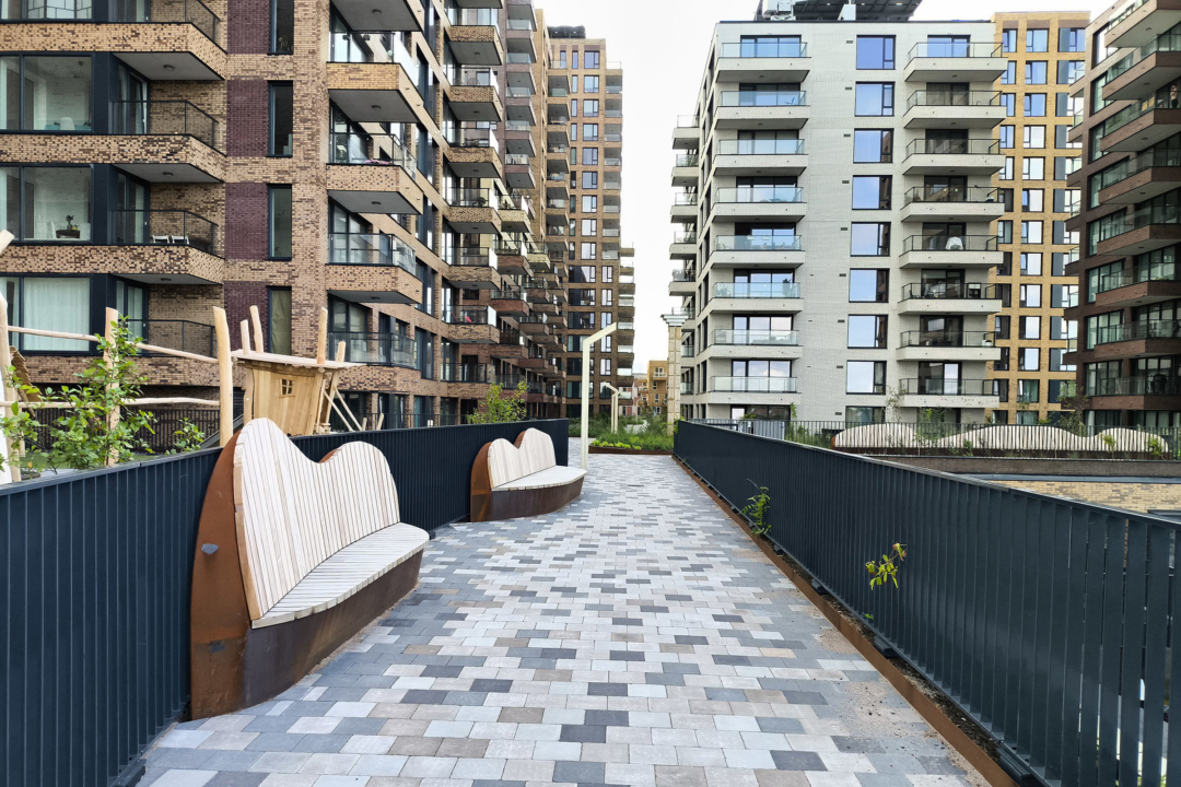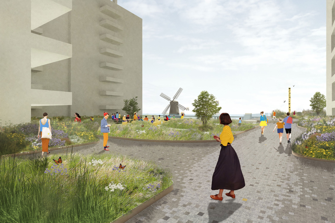 At the heart of the design is the nature‑inclusive, climate‑adaptive rooftop landscape, created by LOLA Landscape Architects in collaboration with Deltavormgroep. This green space lies like a ‘landscape archipelago’ on top of the parking structure and acts as an organising element between the residential buildings. The rooftop landscape offers a rich mosaic of planting, places to dwell, and routes inspired by the waterways and long, narrow plots of the traditional agricultural landscape.