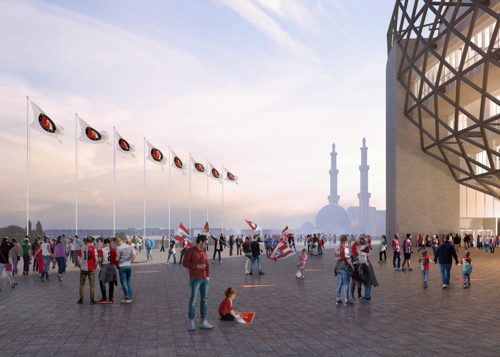 The concourse design of the new Feyenoord Stadium features a performative public space in a double role for both stadium and a new city district. On match days the crowds will gather before entering the Stadium, but the concourse will also distribute several slow traffic routes along the water and into the surrounding neighborhoods. From the concourse the visitor can view both into the stadium and out over the river in both directions of the river bend. Sports and recreational activities can take place along a year-round agenda that extends into the neighboring public spaces of the Strip, the Mallegat Park and the Waterfront.