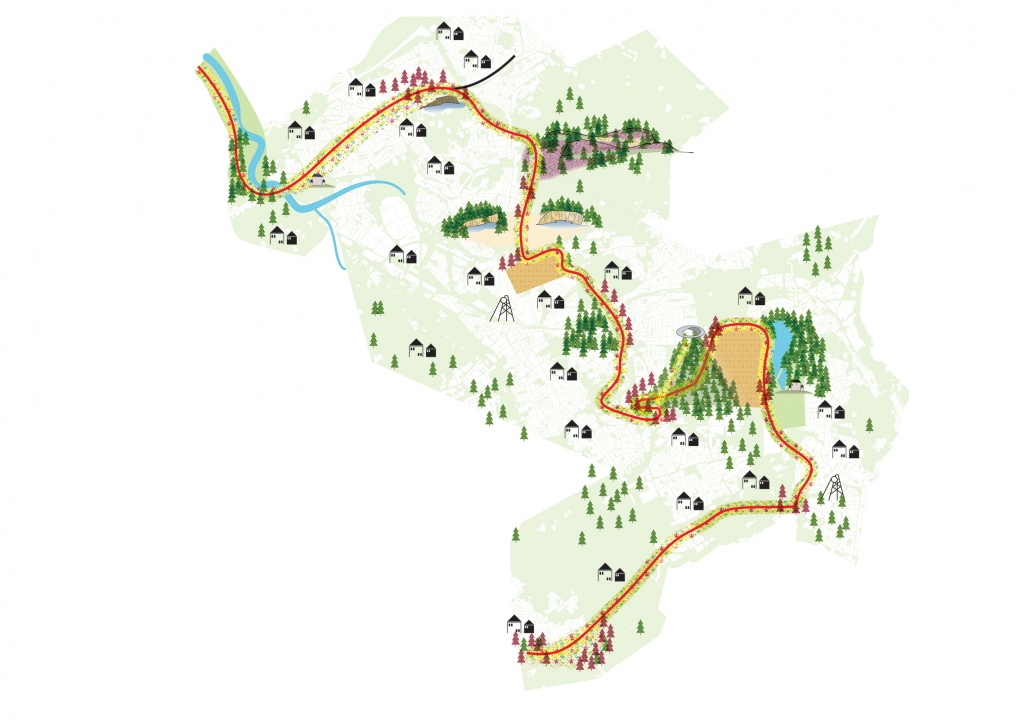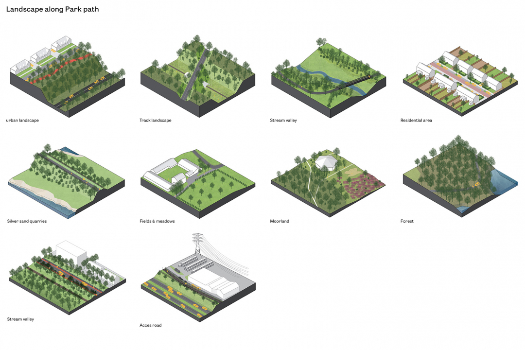 The Parkstadroute is a recreational route (for cycling and hiking) of 35 kilometres, through IBA Parkstad, a region in the Netherlands that used to be known for its coal mining. The route is designed as a recreational route, revealing all the highlights and special landscapes of Parkstad, amongst which are quarts sand quarries, purple coloured heather landscapes, old relicts of mines and castles and man-made terral hills.