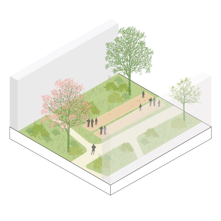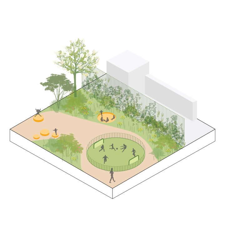 Merwede’s carefully designed new public space design turns the surrounding building greenery into a new type of street called “the wondering trail”— which winds intuitively through the area without excess rules and measures. The transitional areas, where the public space and inner gardens meet, are crucial in ensuring a coherent connection.