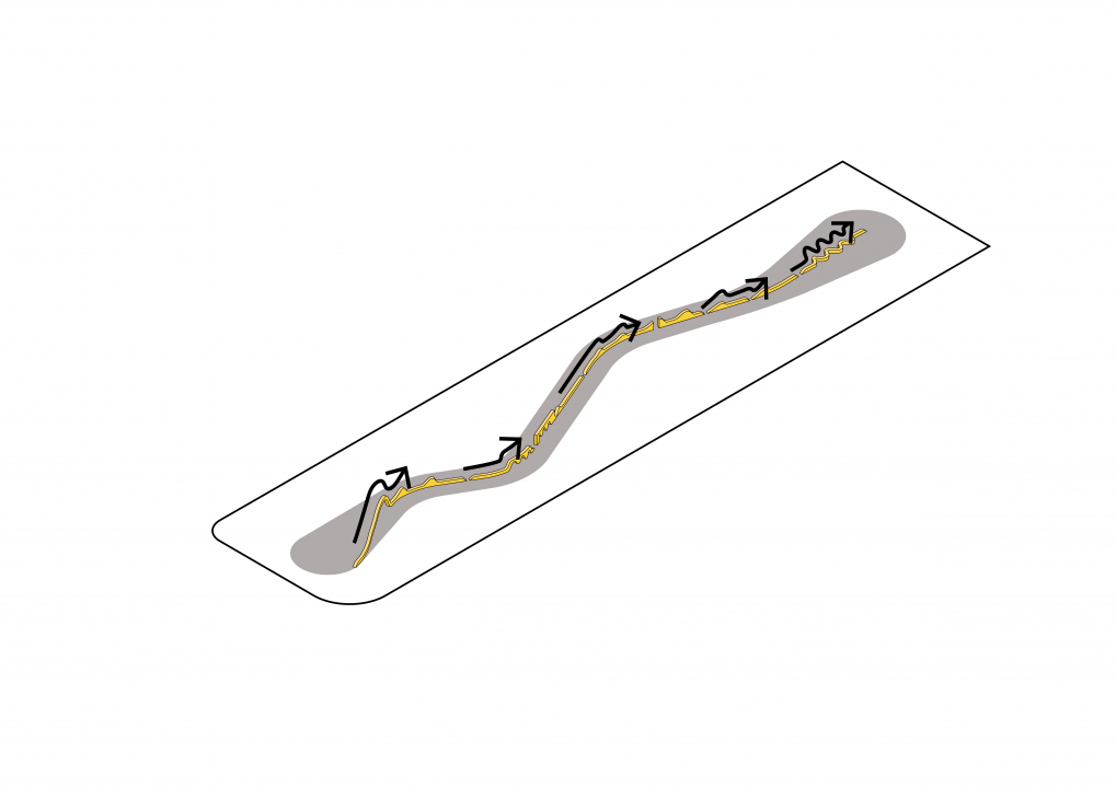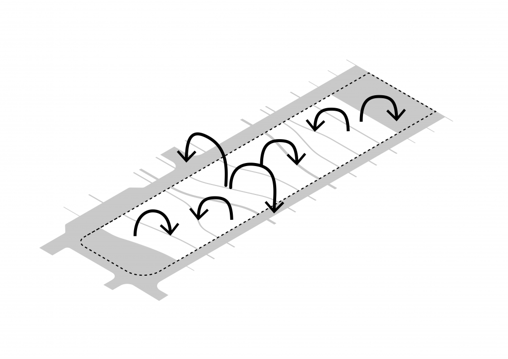 Rainwater collection plays a significant role in the new park. During and after large rain showers, the water is transported through a system of gutters that meander through the park. From the lower parts, where it briefly becomes a pond, the water can sink into the ground. These gutters are also built from recycled bricks.